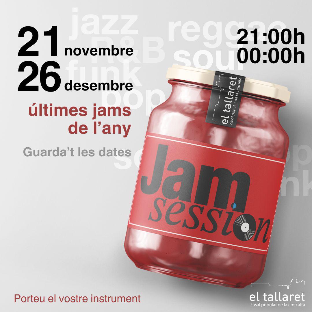Últimes Jams session de l’any! Posted on 14 de novembre de 2025 by Difusió El Tallaret 21 de novembre i 26 desembrede 21:00h a 00:00h Porta el teu instrument i delecta’ns amb la música! I si no tens instrument, pots venir igualment i passar una bona estona!